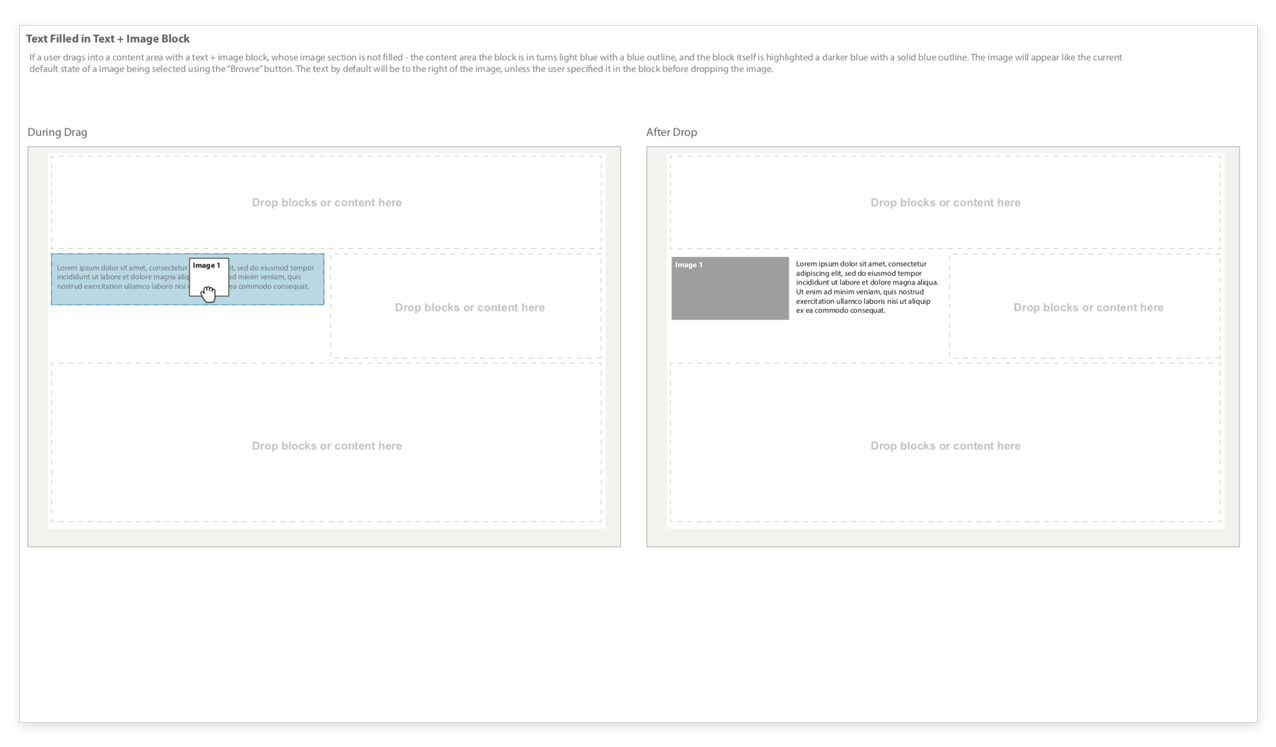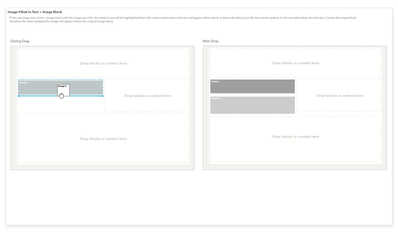 Since dragging into the editor, the “content block” - or sections in a template where you could put content - could be empty or already filled, I went through and mapped the various permutations of these scenarios to see how a piece of content would react default.